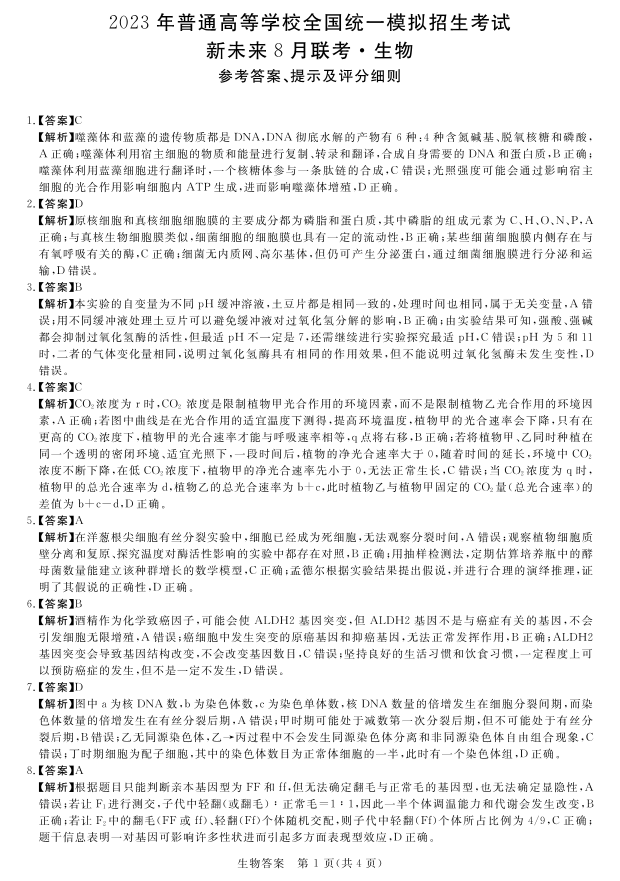 高三生物答案--新未来2023高三8月联考