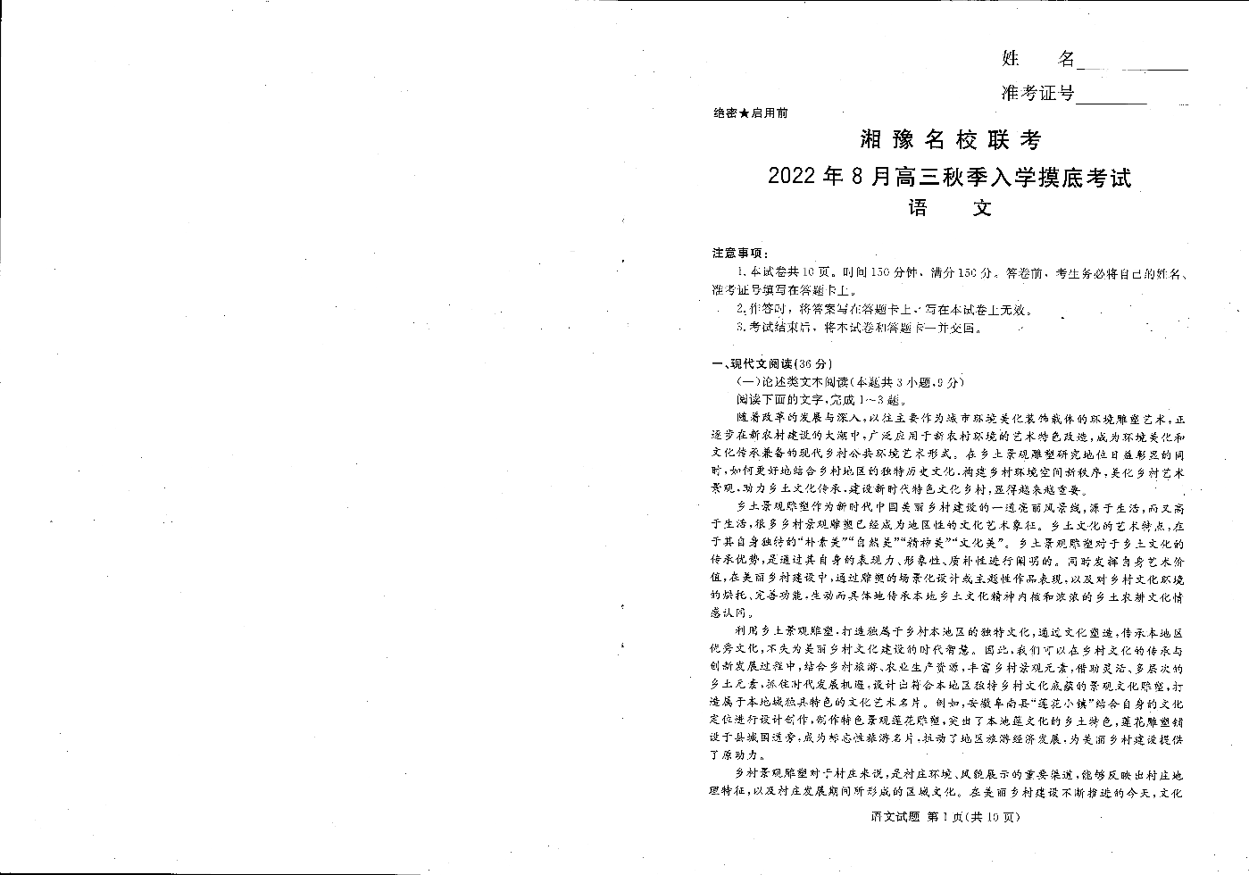 高三语文--湘豫名校联考2023高三8月入学摸底考试
