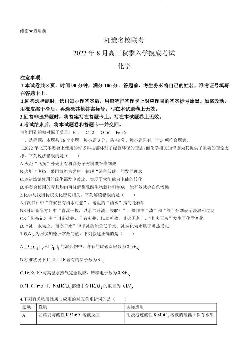 高三化学+答案--湘豫名校联考2023高三8月入学摸底考试
