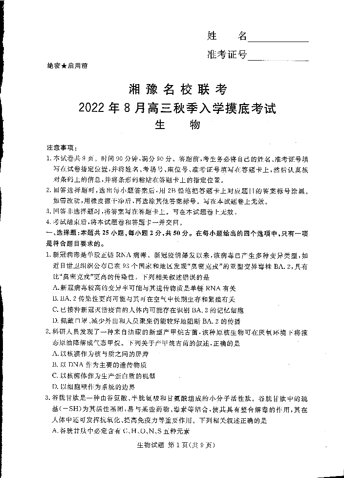 高三生物--湘豫名校联考2023高三8月入学摸底考试