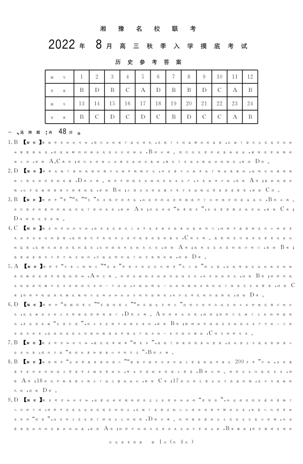 高三历史答案--湘豫名校联考2023高三8月入学摸底考试