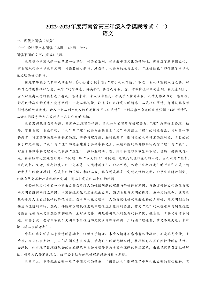 高三语文--河南省创新发展联盟2023高三上学期开学摸底考试