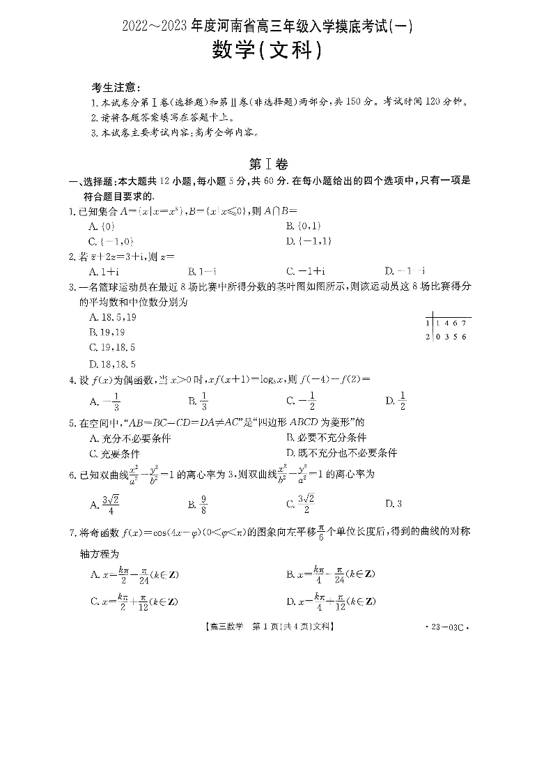 高三文科数学--河南省创新发展联盟2023高三上学期开学摸底考试