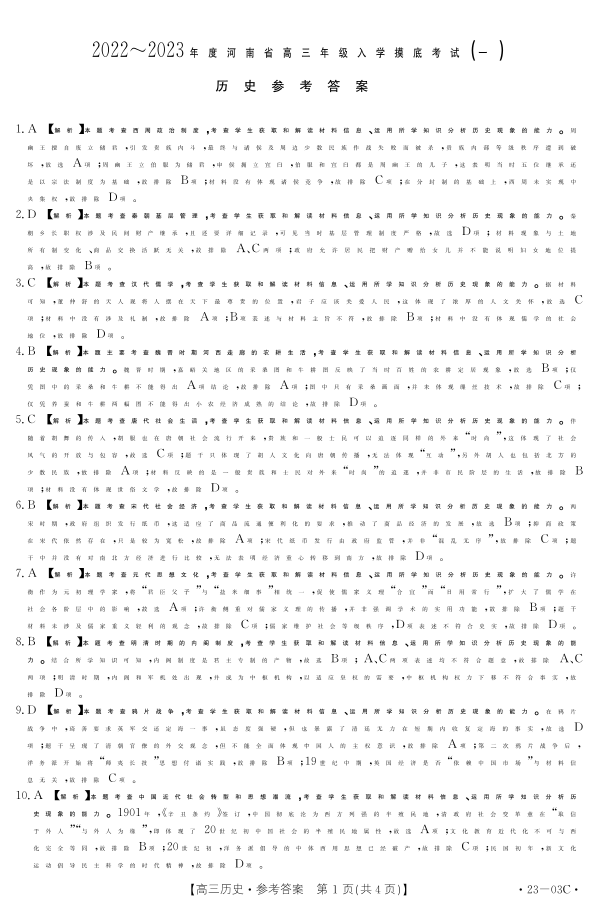 高三历史答案--河南省创新发展联盟2023高三上学期开学摸底考试