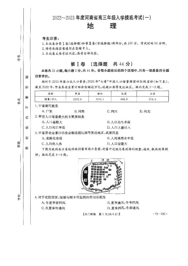 高三地理--河南省创新发展联盟2023高三上学期开学摸底考试