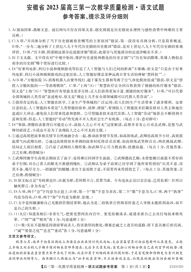 高三语文答案--安徽省十联考2023高三上学期第一次教学质量检测