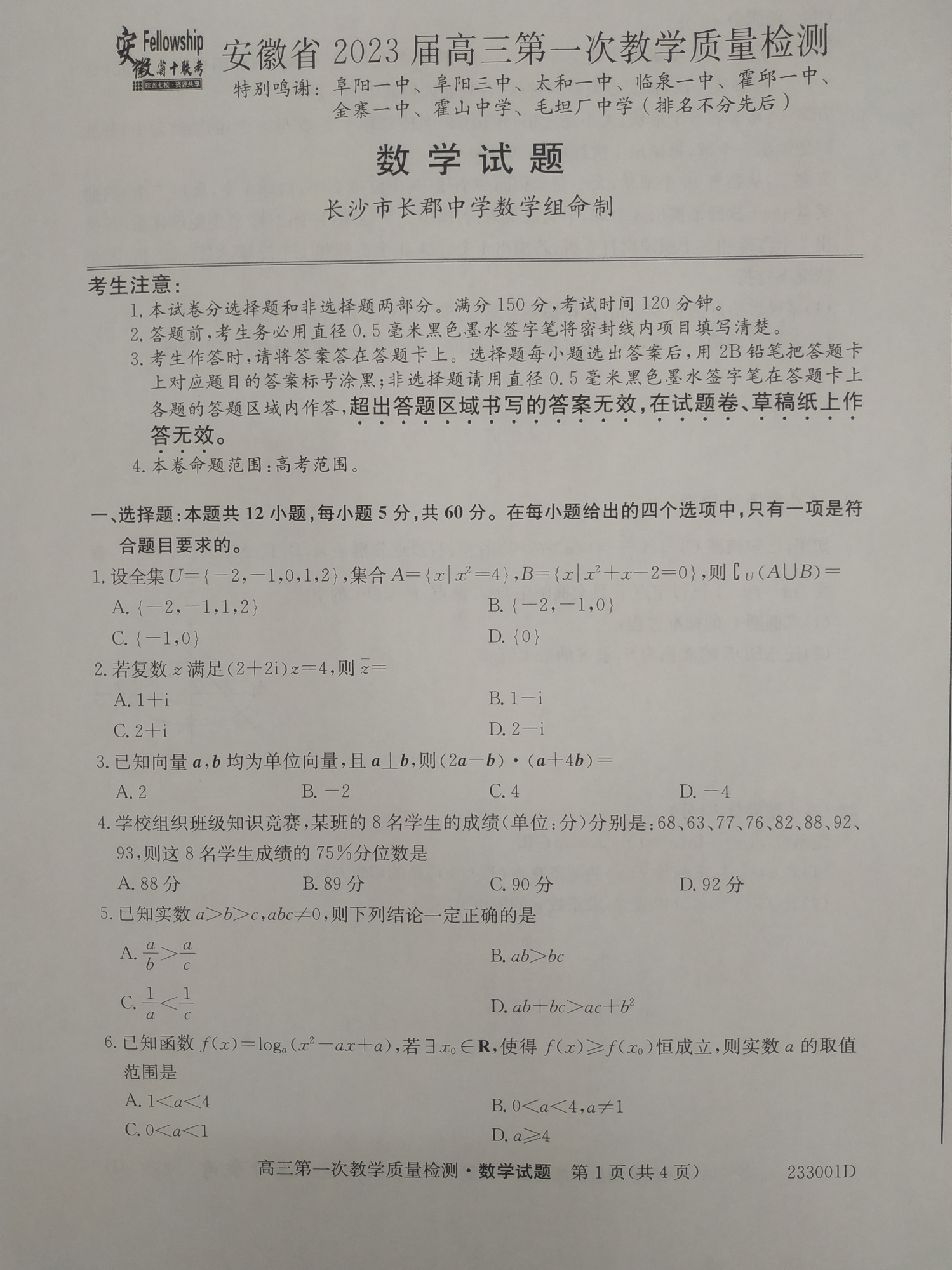 高三数学--安徽省十联考2023高三上学期第一次教学质量检测