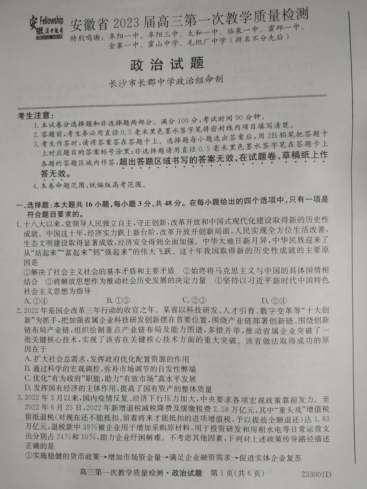 高三政治--安徽省十联考2023高三上学期第一次教学质量检测