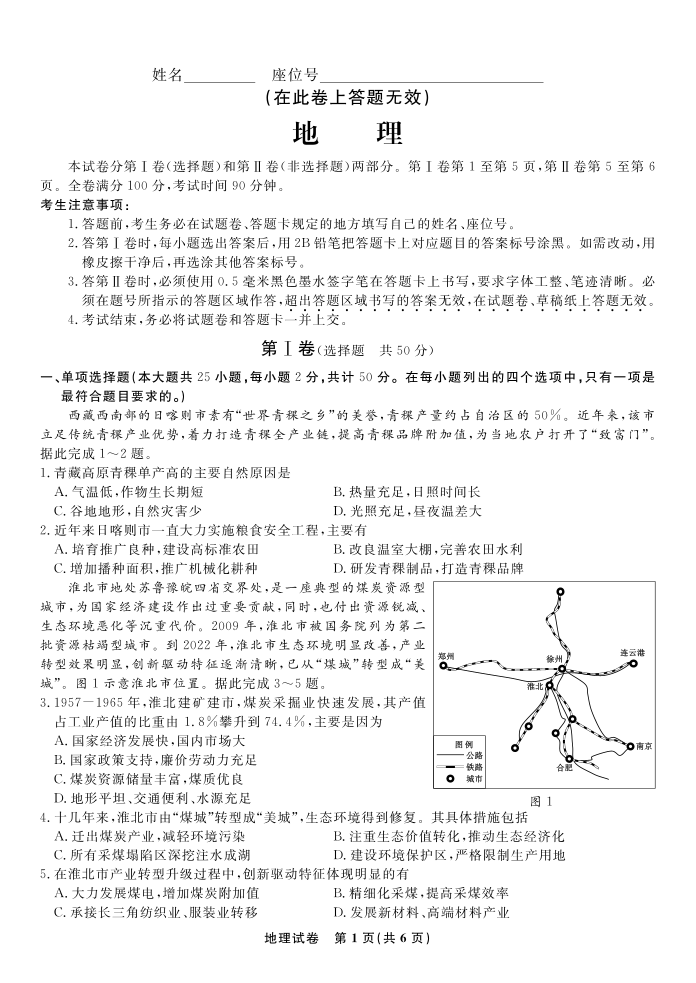 高三地理--安徽省蚌埠市2023高三第一次质量检查