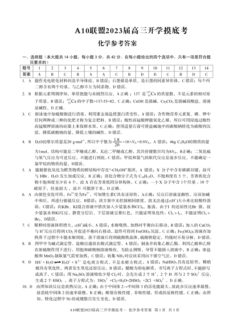 高三化学答案--安徽省A10联盟2023高三上学期开学考试