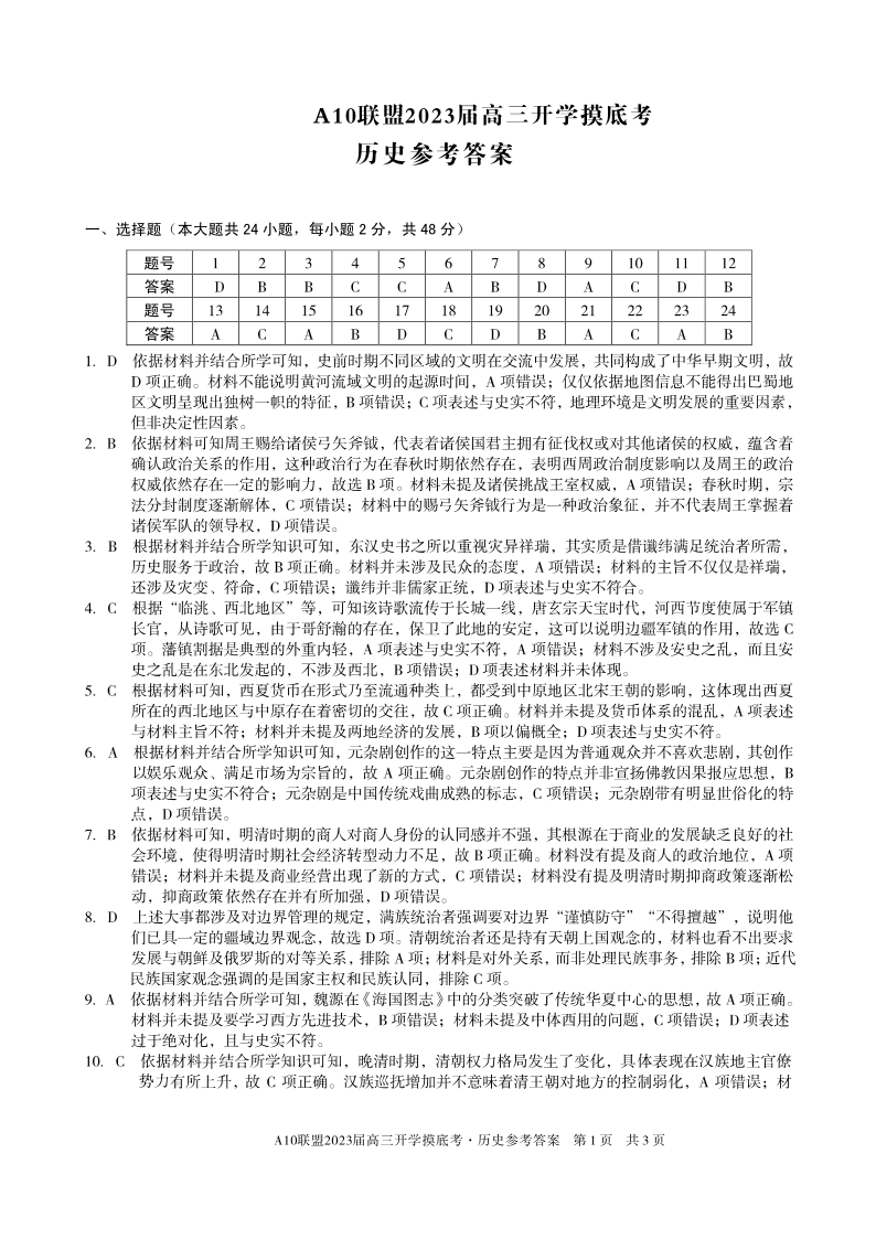 高三历史答案--安徽省A10联盟2023高三上学期开学考试8.29-30