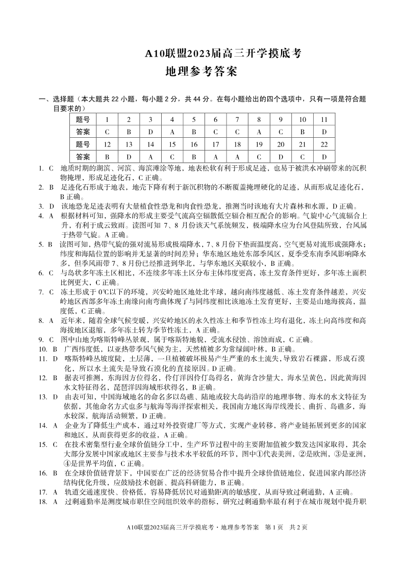 高三地理答案--安徽省A10联盟2023高三上学期开学考试