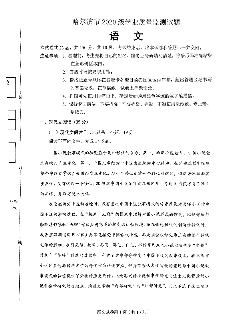 高三语文--黑龙江省哈尔滨市2022-2023学年高三8月学业质量监测