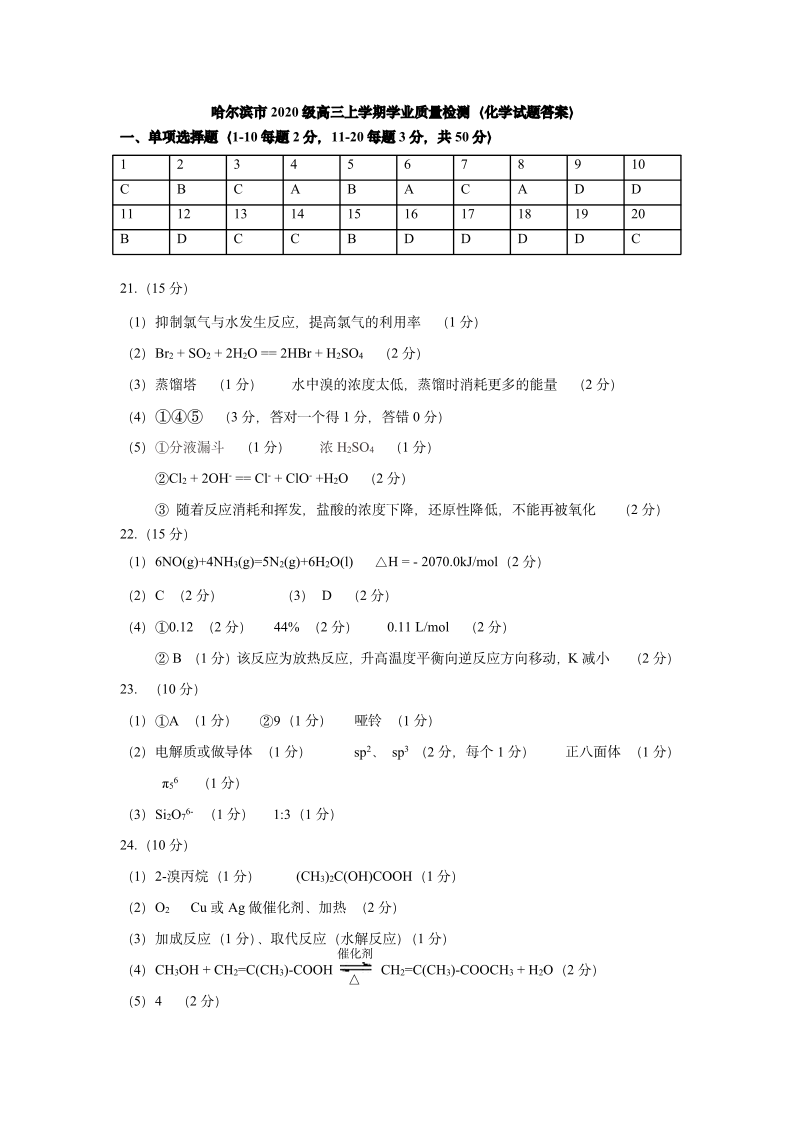 高三化学答案--黑龙江省哈尔滨市2022-2023学年高三8月学业质量监测
