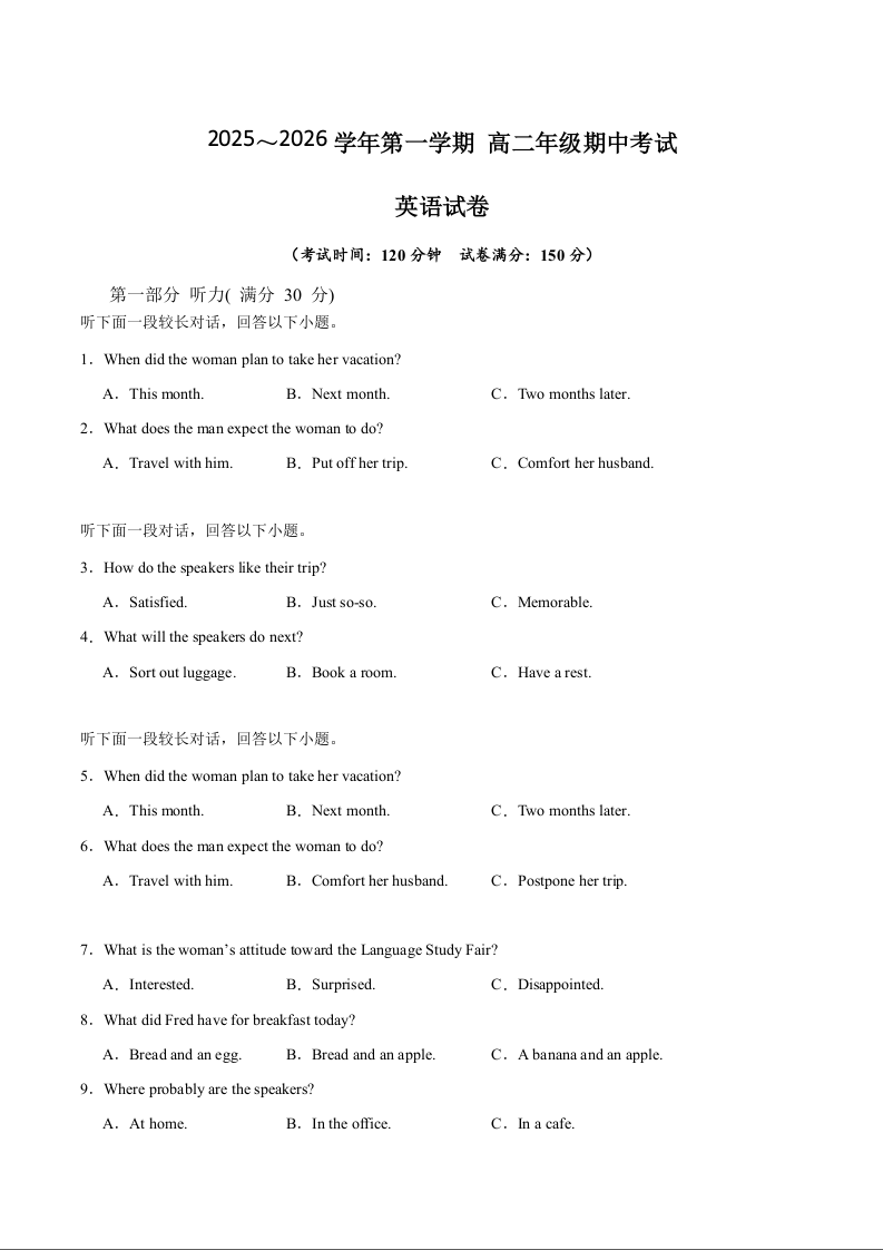 高二英语+答案--内蒙古呼和浩特市第二中学2025-2026学年高二上学期期中考试