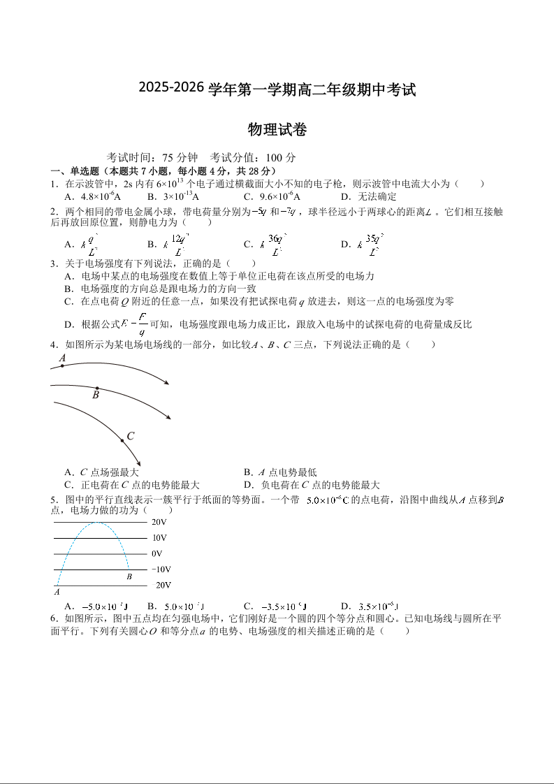 高二物理+答案--内蒙古呼和浩特市第二中学2025-2026学年高二上学期期中考试