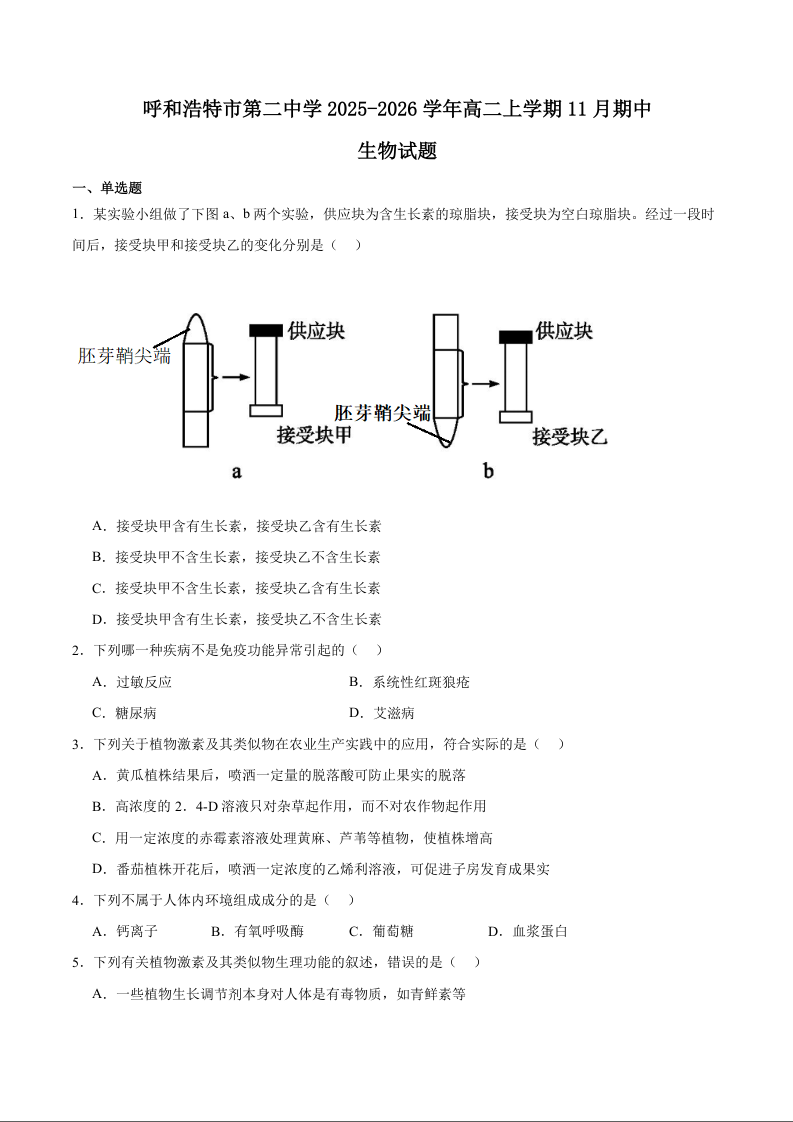 高二生物+答案--内蒙古呼和浩特市第二中学2025-2026学年高二上学期期中考试