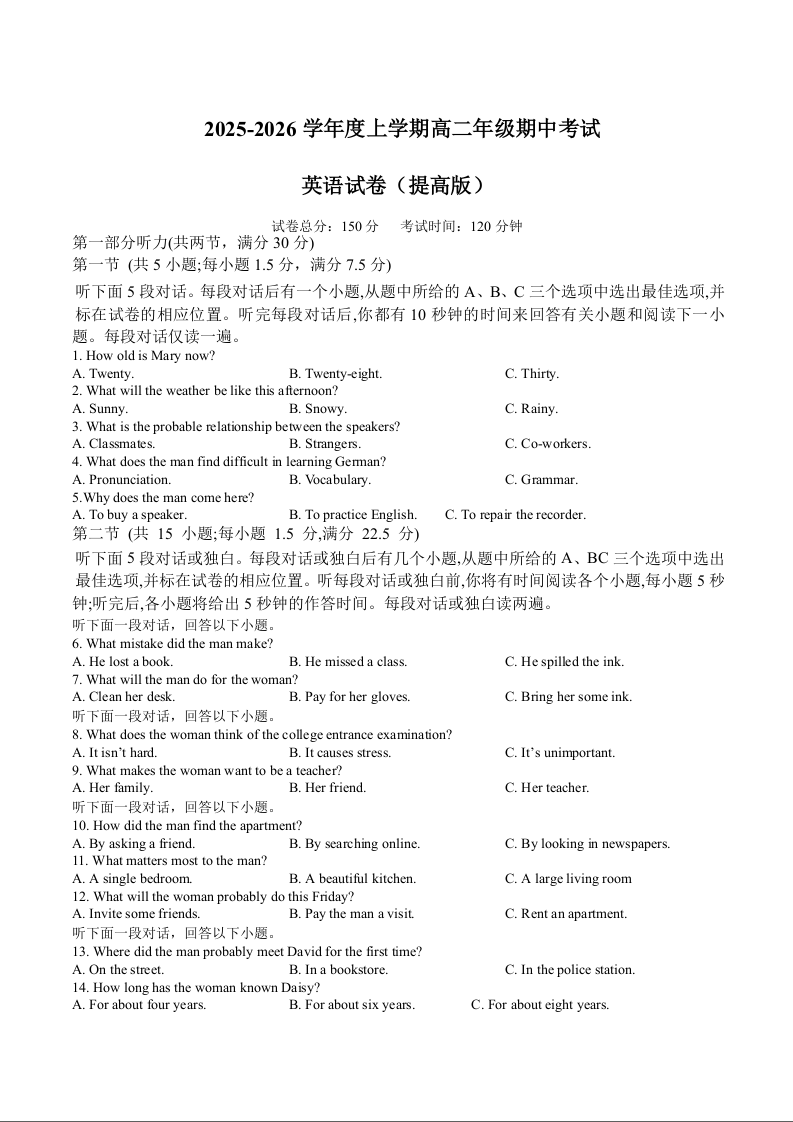 高二英语(提高)+答案--江西省上饶市2025-2026学年高二上学期期中考试