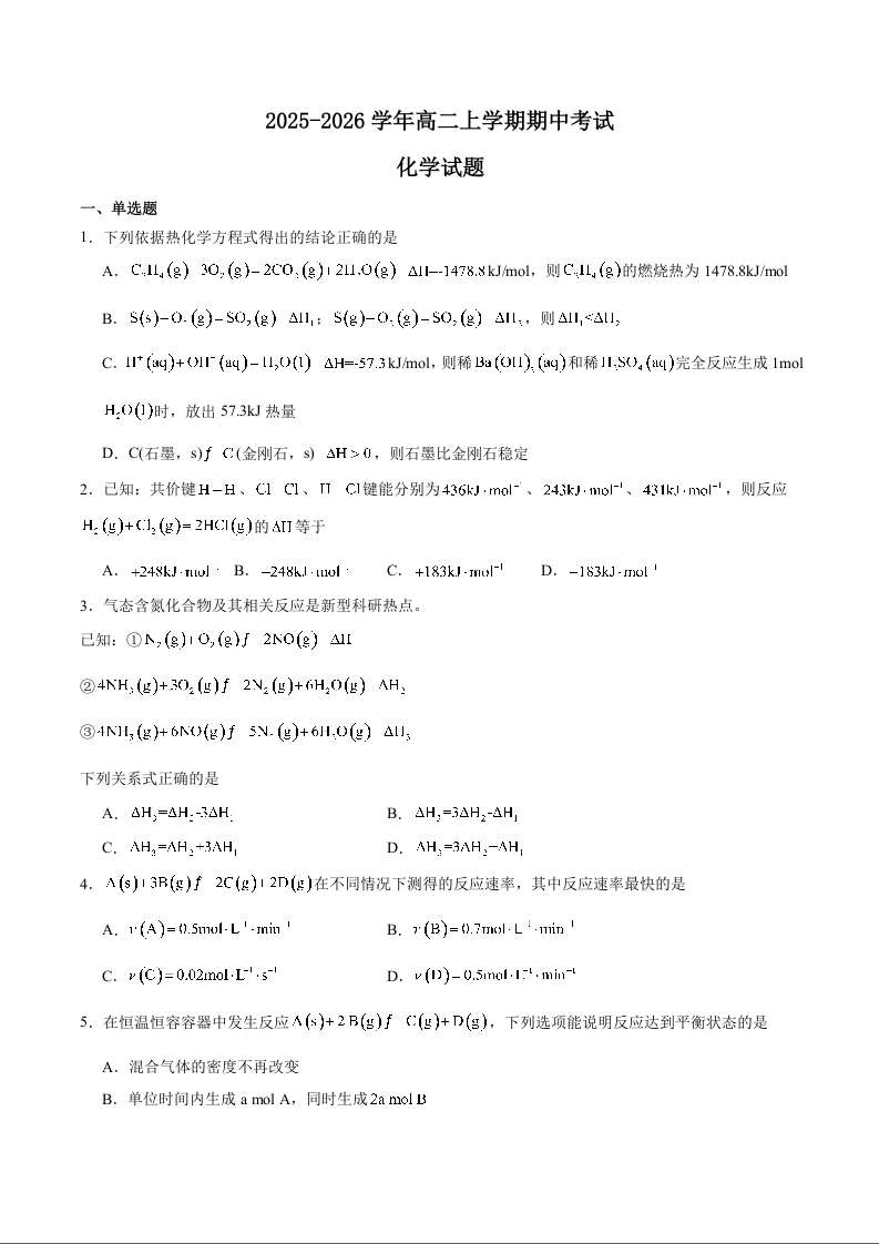 高二化学+答案--江西省上饶市2025-2026学年高二上学期期中考试