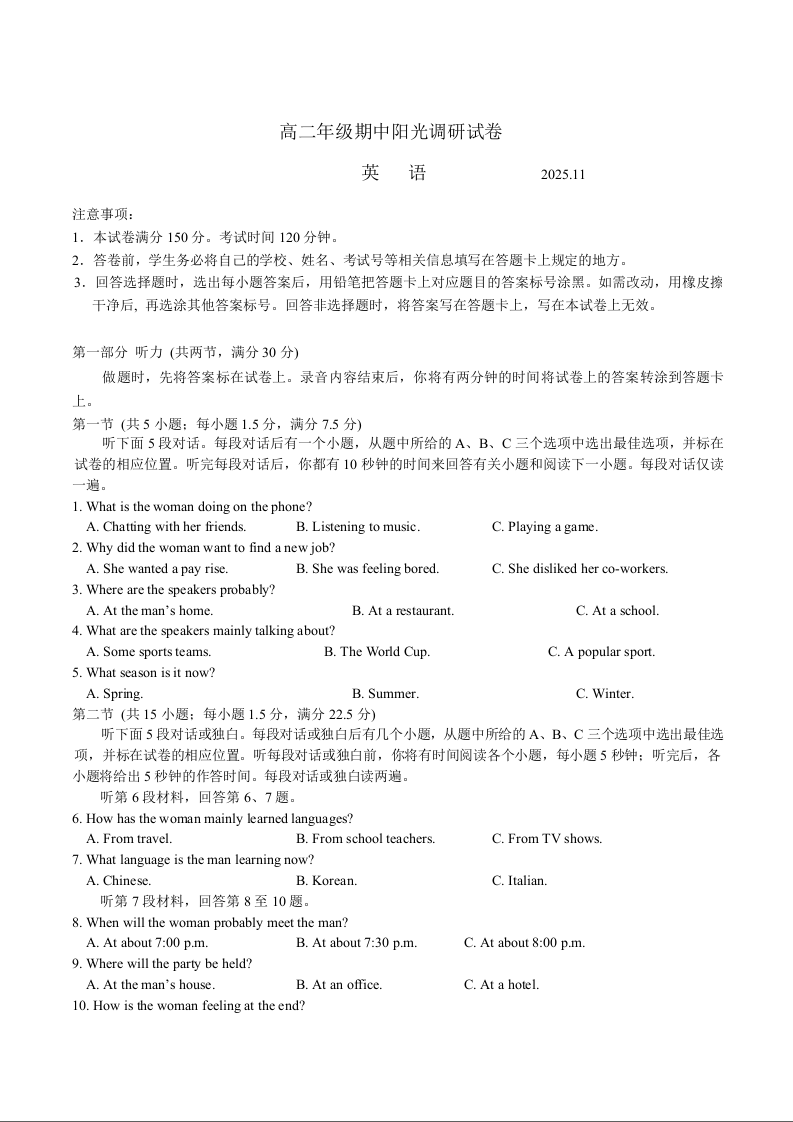 高二英语+答案--江苏省苏州市2025-2026学年高二上学期期中考试