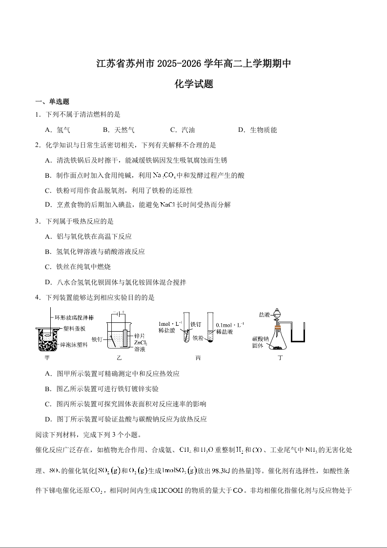 高二化学+答案--江苏省苏州市2025-2026学年高二上学期期中考试