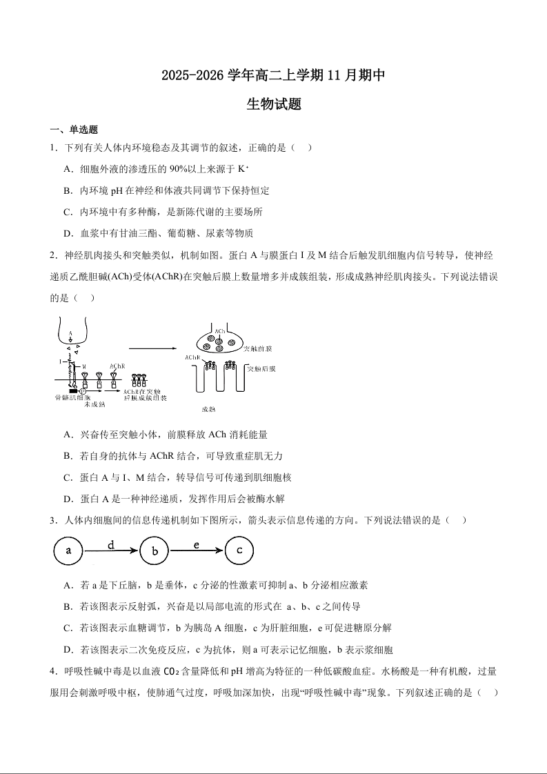 高二生物+答案--江苏省常州高级中学2025-2026学年高二上学期期中考试