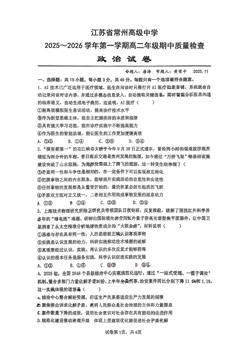 高二政治+答案--江苏省常州高级中学2025-2026学年高二上学期期中考试