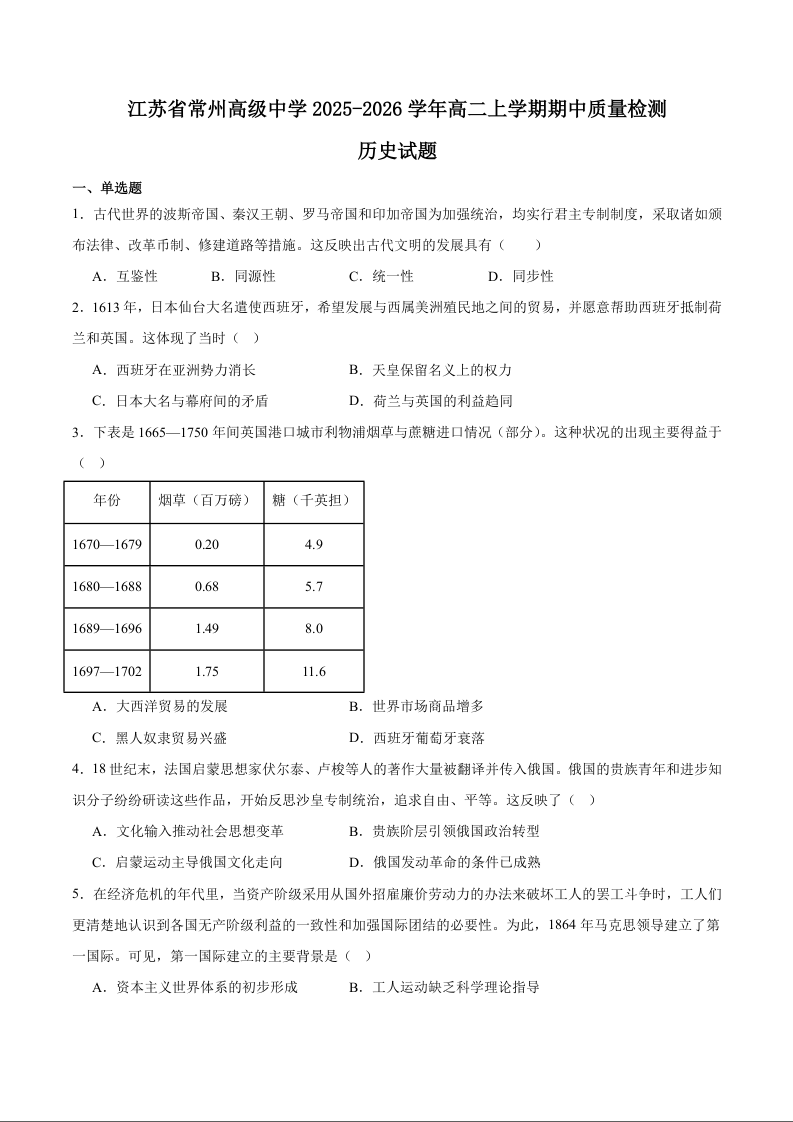 高二历史+答案--江苏省常州高级中学2025-2026学年高二上学期期中考试