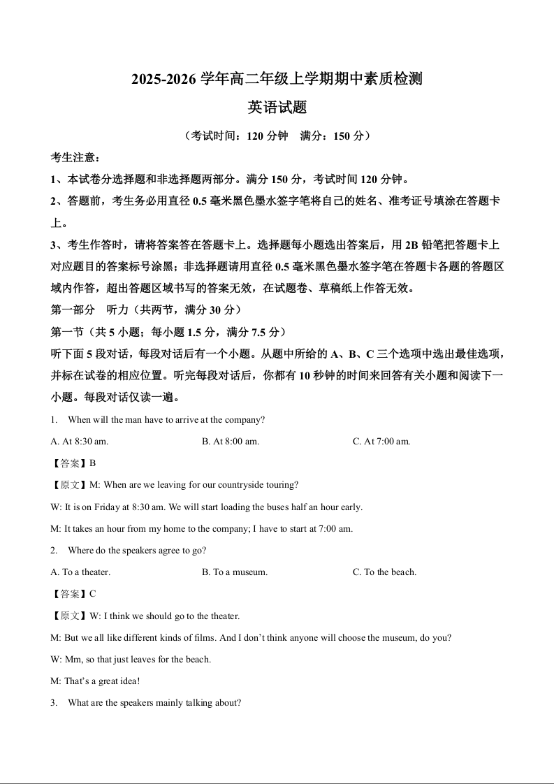 高二英语+答案--安徽师范大学附属中学2025-2026学年高二上学期期中考试
