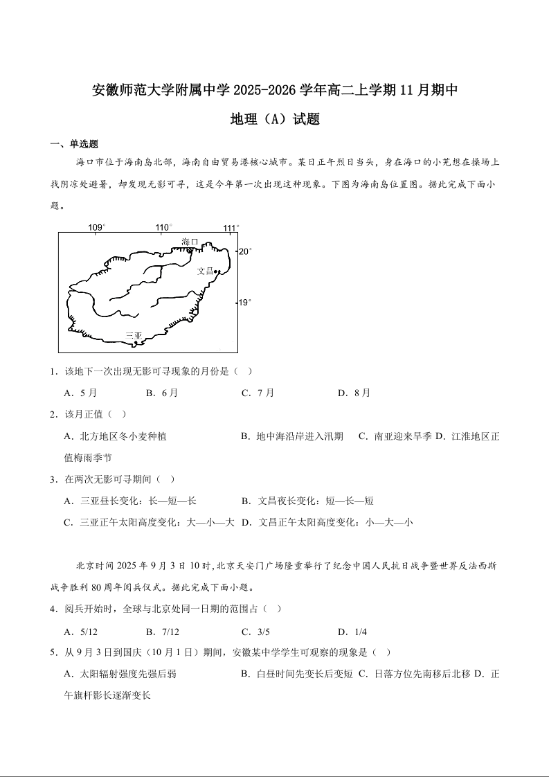 高二地理+答案--安徽师范大学附属中学2025-2026学年高二上学期期中考试