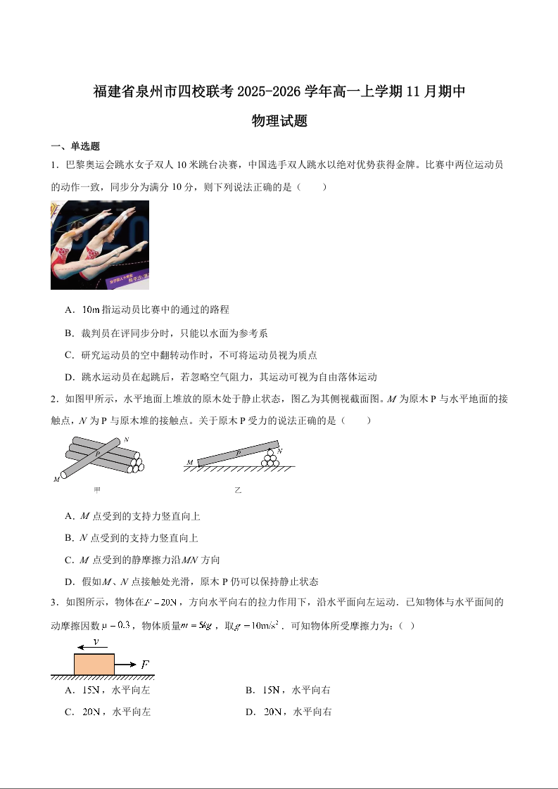 高一物理+答案--福建省泉州市四校联考2025-2026学年高一上学期期中考试
