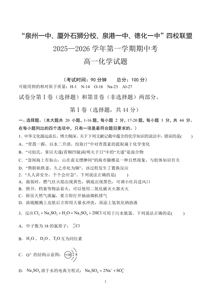 高一化学+答案--福建省泉州市四校联考2025-2026学年高一上学期期中考试