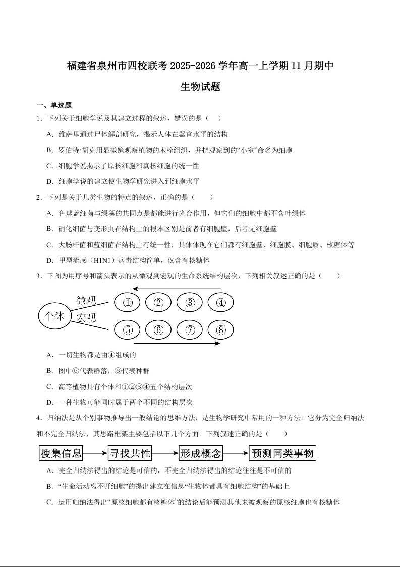 高一生物+答案--福建省泉州市四校联考2025-2026学年高一上学期期中考试