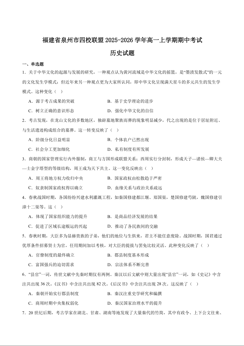 高一历史+答案--福建省泉州市四校联考2025-2026学年高一上学期期中考试