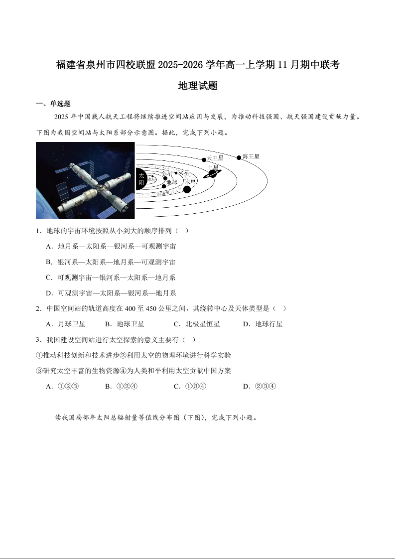 高一地理+答案--福建省泉州市四校联考2025-2026学年高一上学期期中考试