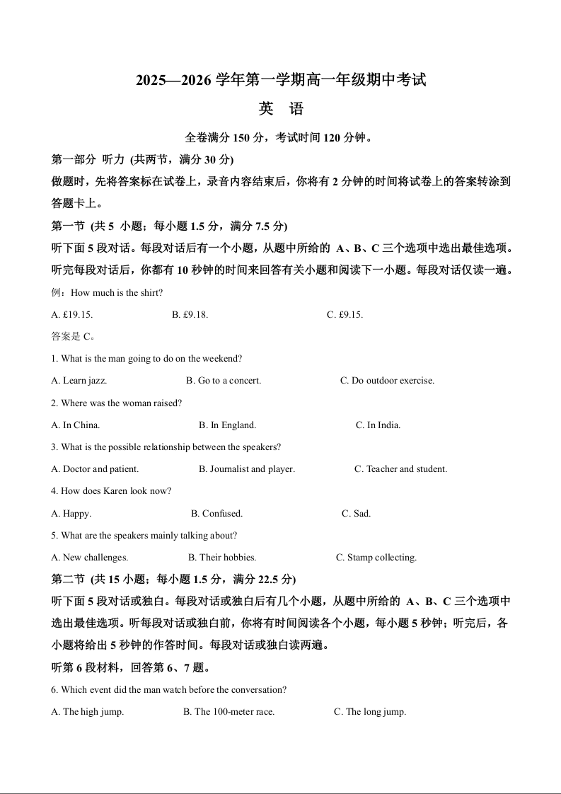 高一英语+答案--河北省邯郸市五校2025-2026学年高一上学期期中考试