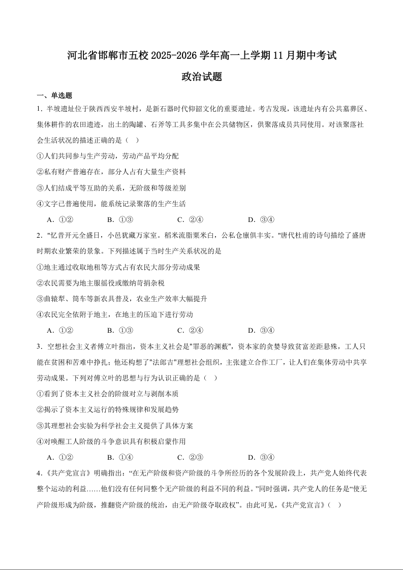 高一政治+答案--河北省邯郸市五校2025-2026学年高一上学期期中考试