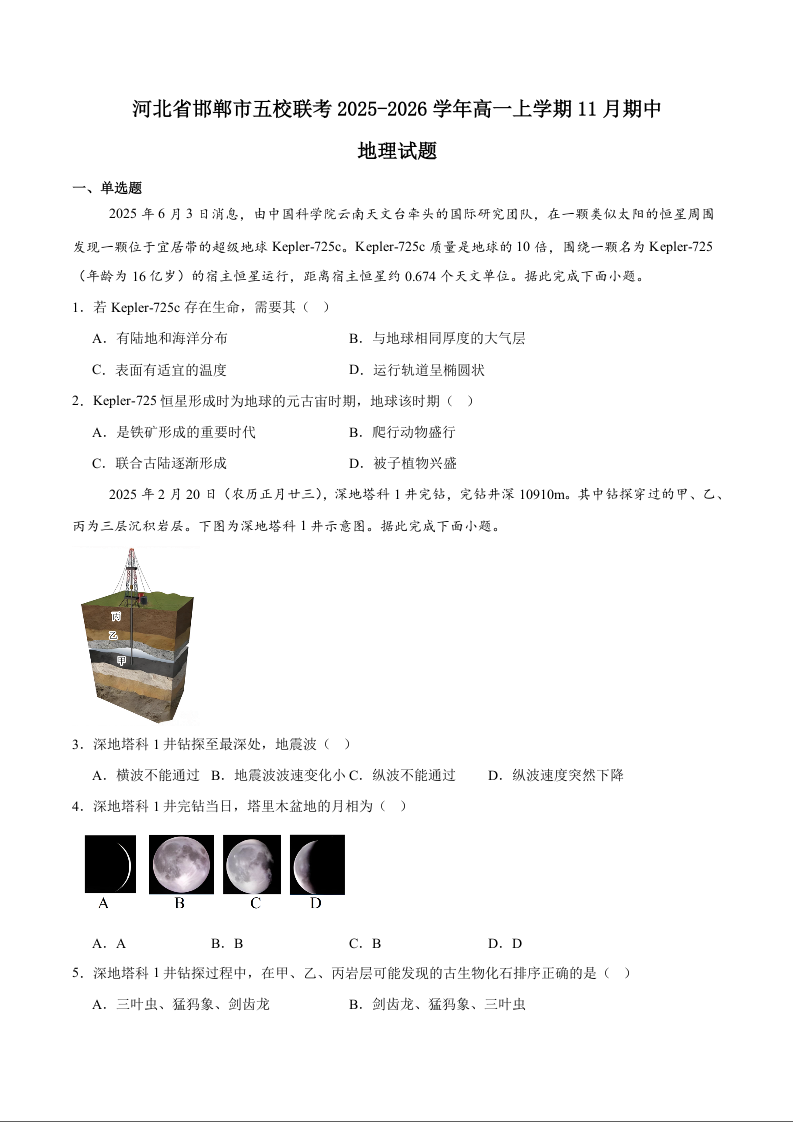 高一地理+答案--河北省邯郸市五校2025-2026学年高一上学期期中考试