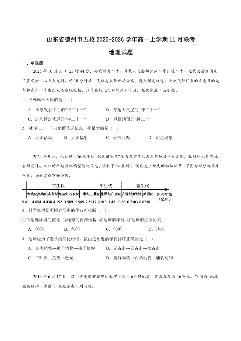高一地理+答案--山东省德州市五校2025-2026学年高一上学期期中联考