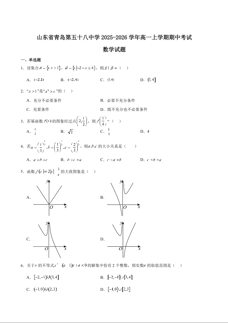 高一数学+答案--山东省青岛第五十八中学2025-2026学年高一上学期期中测试