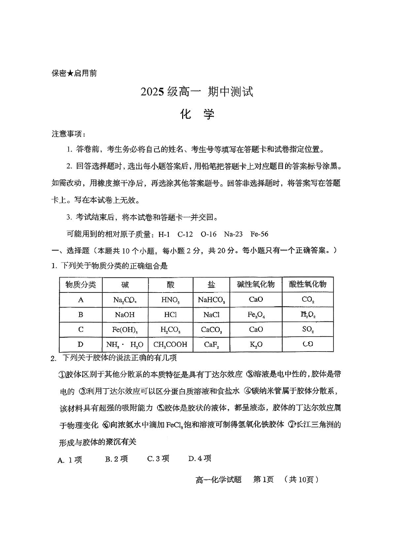 高一化学+答案--山东省青岛第五十八中学2025-2026学年高一上学期期中测试