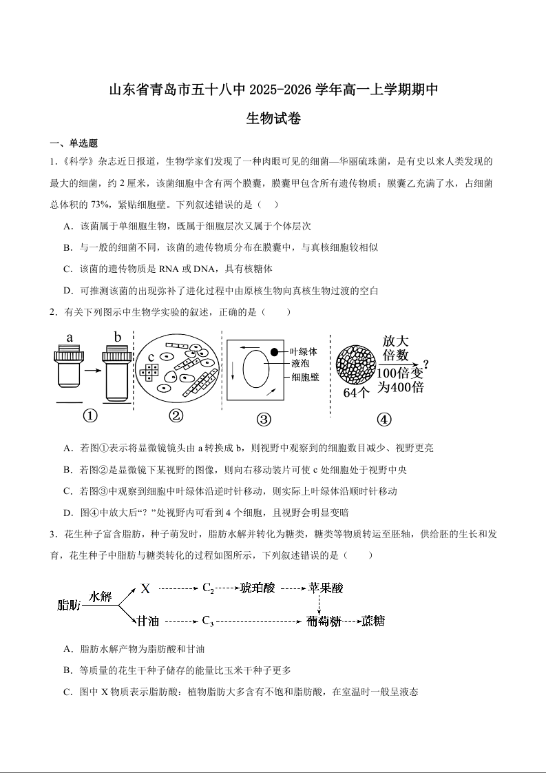 高一生物+答案--山东省青岛第五十八中学2025-2026学年高一上学期期中测试