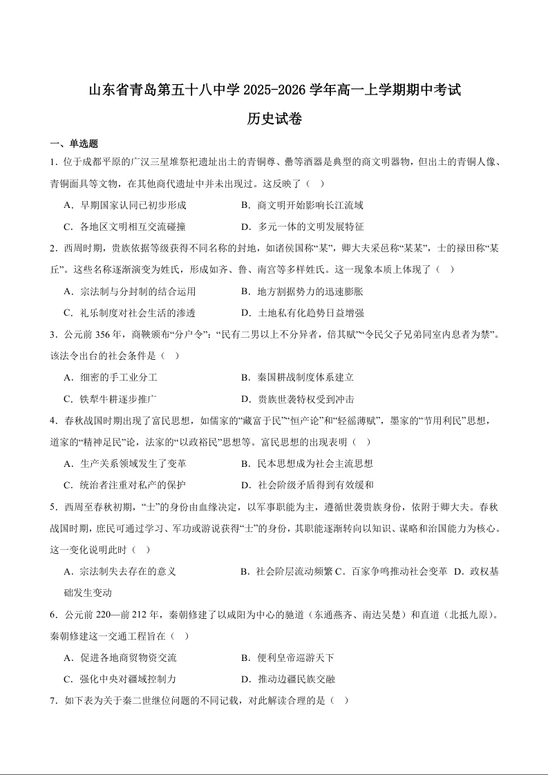 高一历史+答案--山东省青岛第五十八中学2025-2026学年高一上学期期中测试