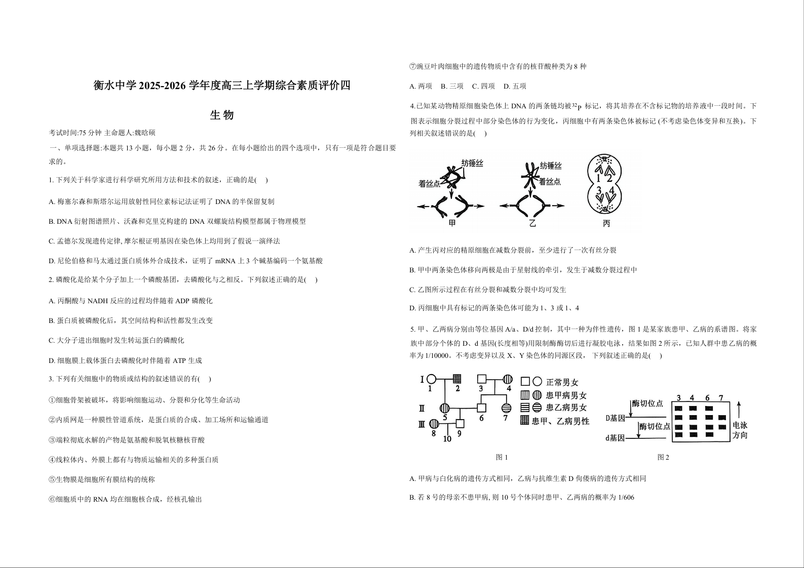 高三生物--河北衡水中学2026届高三上学期12月月考