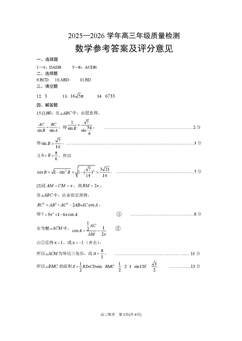 高三数学答案--河南省豫西北教研联盟(平许济洛)高三上学期1月质量检测