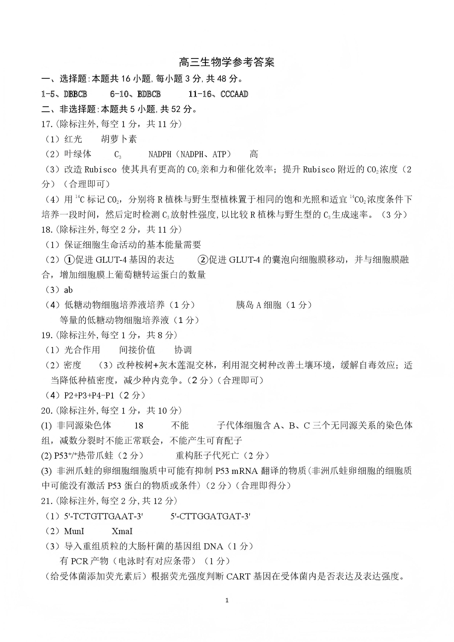高三生物答案--河南省豫西北教研联盟(平许济洛)高三上学期1月质量检测