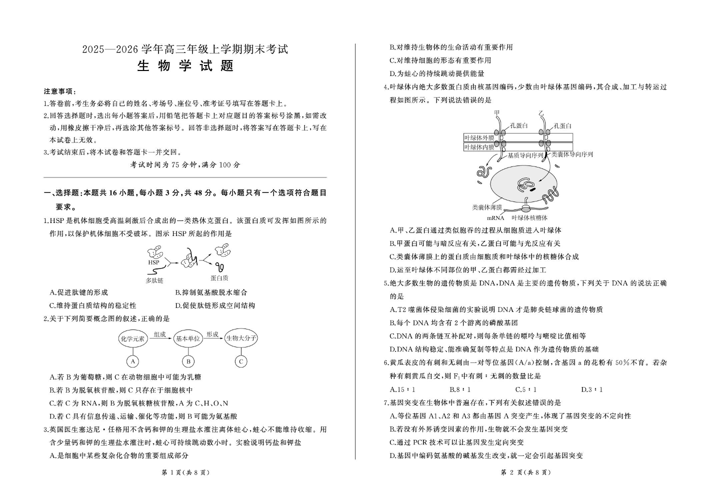 高三生物--百师联盟2026届高三上学期1月期末考试