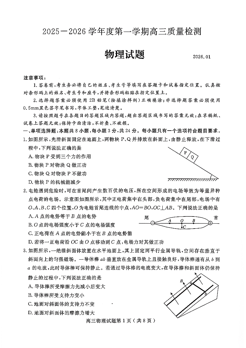 高三物理--山东省济宁市2026届第一学期高三质量检测期末考试