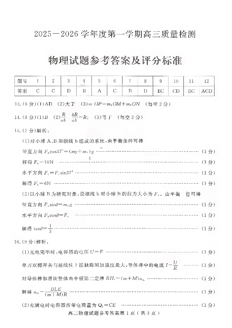 高三物理答案--山东省济宁市2026届第一学期高三质量检测期末考试