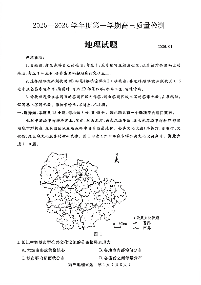 高三地理--山东省济宁市2026届第一学期高三质量检测期末考试